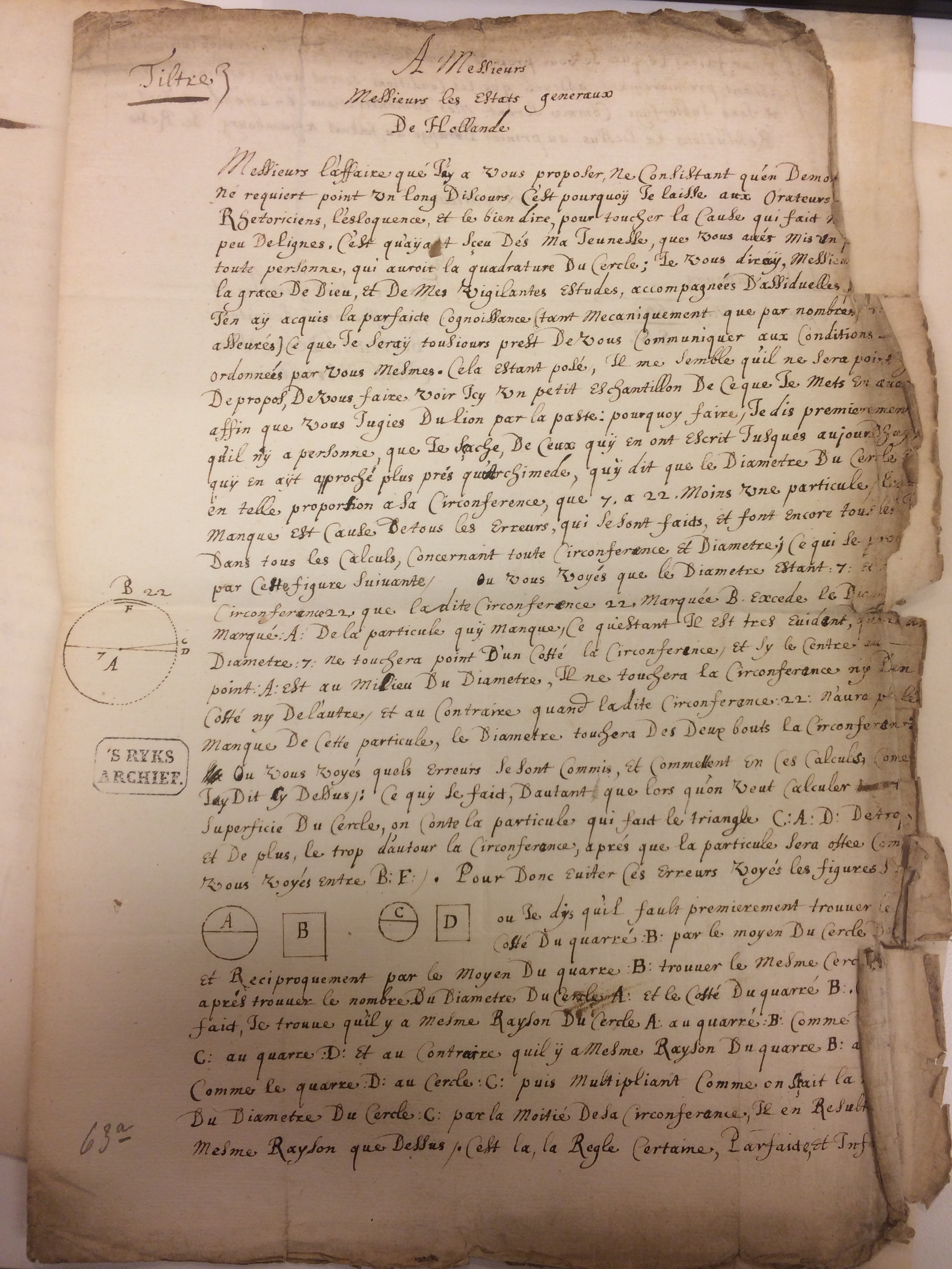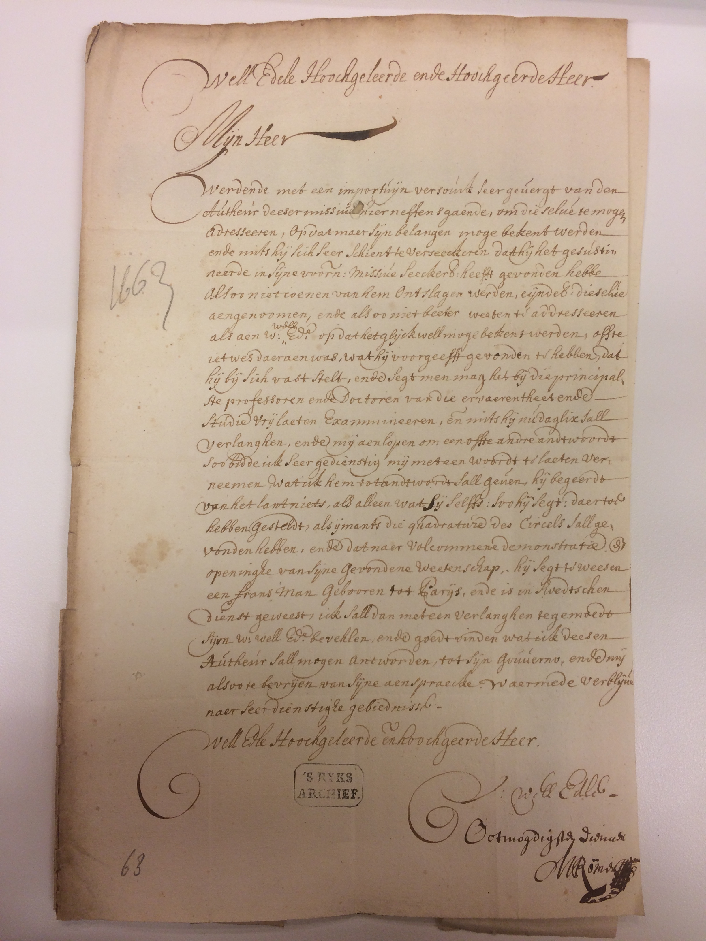 Werdende met een importuyn versouck seer gevergt van den autheur deeser missive hier neffensgaende, om dieselve te mogen adresseeren, opdat maer sijn belangen moge bekent werden, ende mits hij sich seer schient te verseeckeren dat hij het gesustinneerde in sijne voorn[oemde] missive seeckerl[ijk] heefft gevonden, hebbe, alsoo niet coenen van hem ontslagen werden, eyndel[ijk] dieselve aengenoomen, ende alsoo niet beeter weeten te addresseeren als aen Uw Well Ed., opdat het glijck well moge bekent werden offte iet wes daeraen was, wat hij voorgeefft gevonden te hebben, dat hij bij sich vaststelt, ende segt men mag het bij die principalste professoren ende doctoren van die ervaerentheet ende studie vrij laeten exammineeren. Ende mits hij nu daglix sall verlanghen ende mij aenlopen om een offte andre andtwoordt, soo bidde ick seer gedienstig mij met een woordt te laeten verneemen wat ick hem tot antwordt sall geven. Hij begeerdt van het lant niets, als alleen wat sij selffs, soo hij segt daertoe hebben gesteldt, als ijmants die quadrature des circels sall gevonden hebben, ende dat naer volcommene demonstratie ende openinghe van sijne gevondene weetenschap. Hij segt te weesen een Fransman gebooren tot Parijs, ende is in Swedtschen dienst geweest. Ick sall dan met een verlanghen tegemoedt sijen Uw Well Ed. bevehlen, ende goedtvinden wat ick deesen autheur sall mogen antworden tot sijn gouverne, ende mij alsoo te bevrijen van sijne aenspraecke. Waermede verblijve naer seer dienstige gebiednisse.