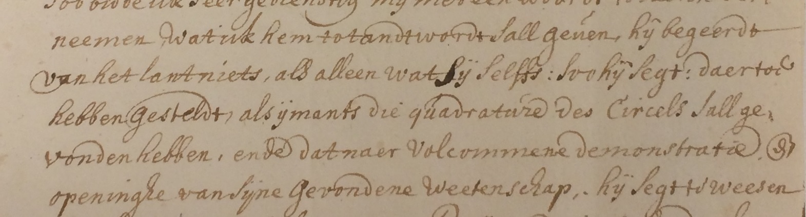 'hij begeerdt van het lant niets, als alleen wat sij selffs soo hij segt daertoe hebben gesteldt, als ijmants die quadrature des circels sall gevonden hebben, ende dat naer volcommene demonstratie ende openinghe van sijne gevondene weetenschap'