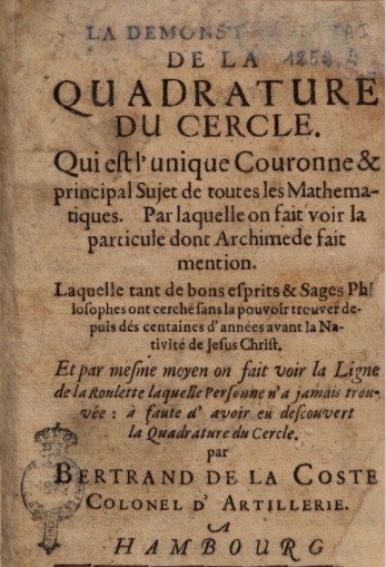 - (10) Bertrand de la Coste, Démonstration de la Quadrature du Cercle, qui est l'unique couronne et le principal sujet de toutes les Mathématiques (Amsterdam, herdruk 1677). https://books.google.nl/books?id=ASjq8PiWxksC&hl=nl&pg=PP9#v=onepage&q&f=false