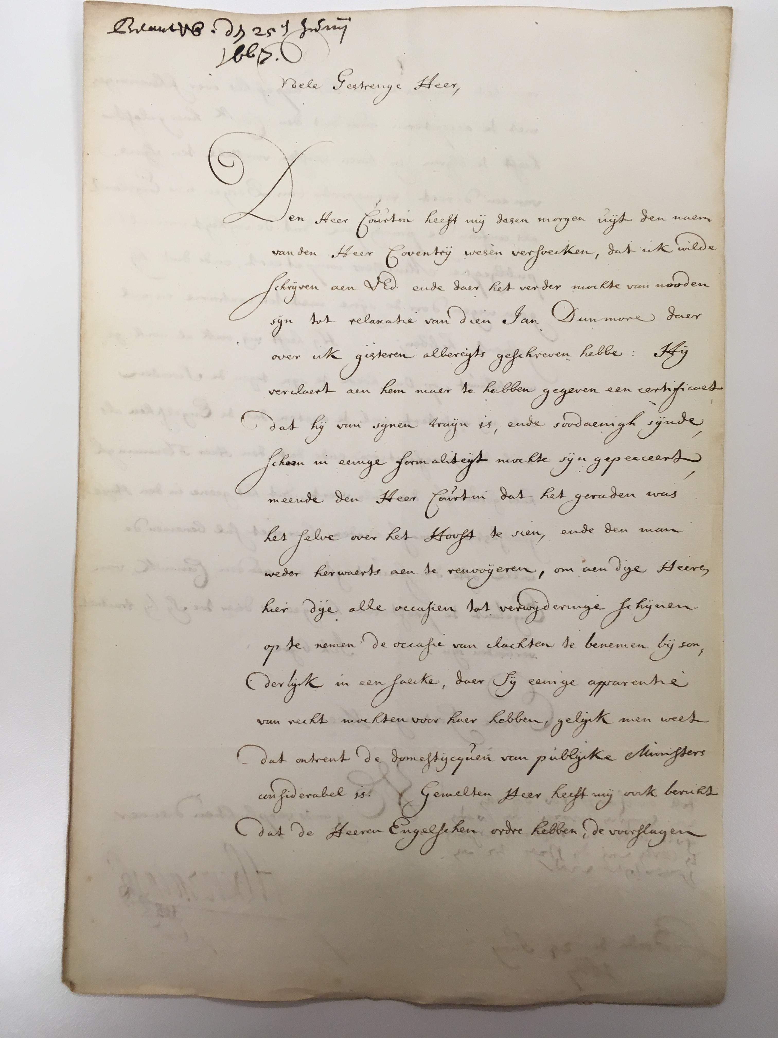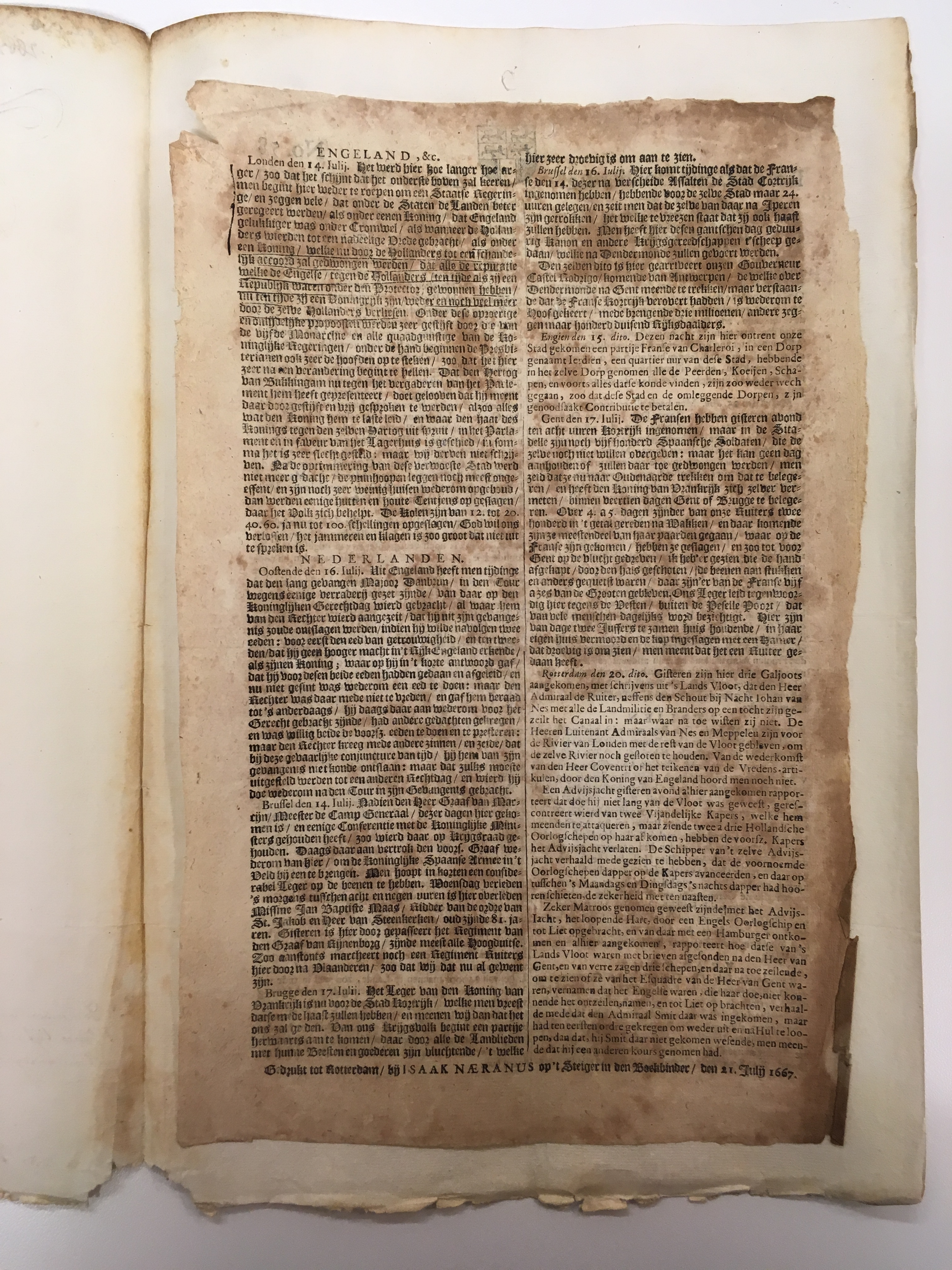 Een bijzonder verzoek doet Van Beverningh in een brief aan De Witt van 23 juli (15). Er was de diplomaat door Baron Denzil Holles, een Engelse afgezant, een krant toegezonden en een vertaling van die krant in het Engels. De krant die Van Beverningh bij zijn brief aan De Witt heeft gevoegd, is ook in De Witts archief bij de brief bewaard gebleven. Het was voor Holles een belangrijke zaak, want hij had de krant met een exprespost aan Van Beverningh gestuurd. In de krant was een bericht opgenomen dat op 14 juli vanuit Londen gestuurd was. Het eerste deel van het bericht las als volgt: