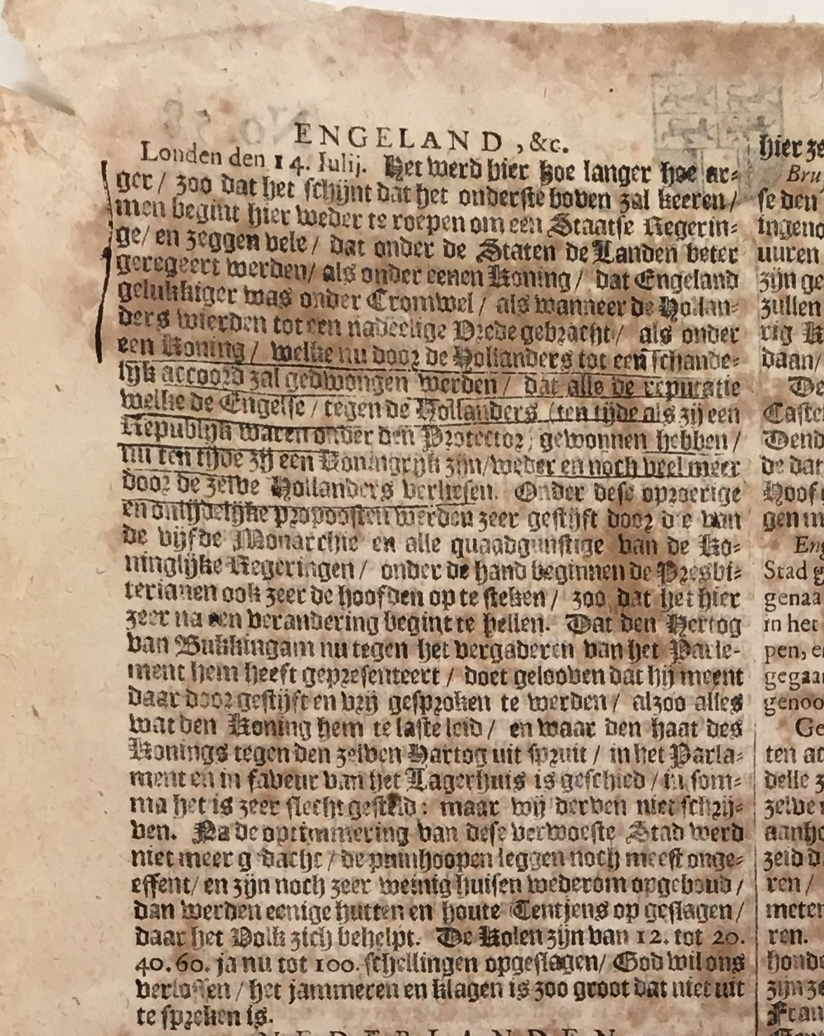 'Het werd hier hoe langer hoe arger, zoo dat het schijnt dat het onderste boven zal keeren; men begint hier weder te roepen om een Staatse regeringe, en zeggen vele, dat onder de Staten de Landen beter geregeert werden als onder eenen koning; dat Engeland gelukkiger was onder Cromwel als wanneer de Hollanders wierden tot een nadeelige Vrede gebracht, als onder een koning, welke nu door de Hollanders tot een schandelijk accoord zal gedwongen werden.'