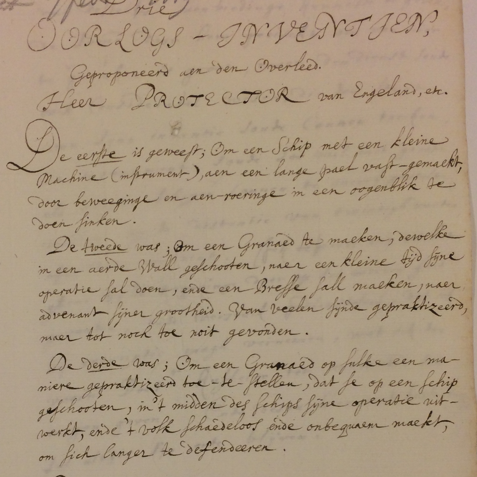 Eer ick uytgingh was Kuffler bij mij, soon van ghene daer Papa sal een verrekijcker in een houte pijpe van hadde (welcke nochtans van sijn broeder geslepen was). Seyde, een inventie van sijn vader te hebben, om een schip met der haest in grondt te helpen, door een soort van een petard, daer een gat doende in slaen van 15 a 16 voeten in 't vierkant; dat de Protector Cromwell hem een groote recompense voor die inventie soude gegeven hebben, maar juyst daerover was komen te sterven'.(16)
